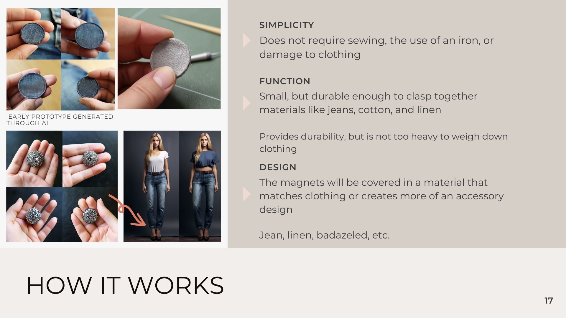 In one of my classes, I was asked to explore the entrepreneurial aspect of the fashion industry and create my own product. While considering what type of product I could bring to the market, I came up with the idea of magnets that can temporarily alter your clothes for the night! I created a mock-up of the magnets using AI imagery and developed this concept as a quick and easy way to shorten your pants or tighten your shirt for an evening. Below is a presentation highlighting the product and its details.